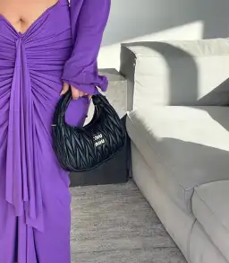 The Wander bag is reinterpreted season after season, becoming an iconic accessory of Miu Miu collections. Made of matelassé nappa leather, the bag is characterized by the sophisticated, three-dimensional effect created by the refined workmanship. The hobo shape, blending retro inspirations and contemporary elegance, becomes a new synonym of modern femininity.
