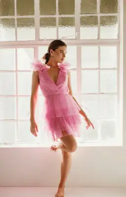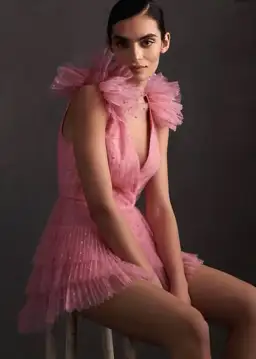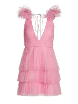Flourishing with whimsical detail, this fairy-tale mini dress boasts dynamic tulle pleats and voluminous ruffle accents for a best-dressed guest look.