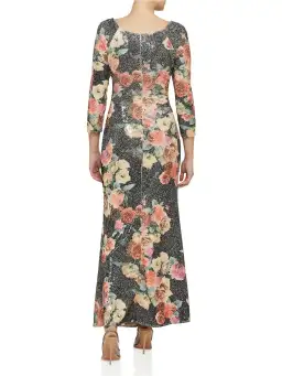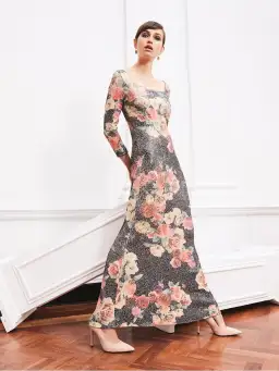 This elegant floral gown by Moss and Spy will make you feel like a Queen. It is crafted from an all-over sequined fabric, that is fitted through the body and falls to a floor-length. With an elegant wide rounded neckline and long sleeves, it's the perfect dress to hire for an upcoming cocktail party or wedding guest look.