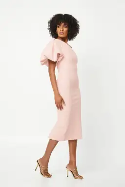 Beautiful cocktail dress design, one sleeve (balloon style) with zip at the back. Lovely thick material. Blush pink colour, looks gorgeous on. This will fit a size 10 - 12. True to size