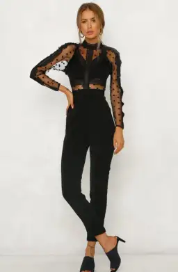 The Find You Again Jumpsuit is a unique piece with edge. Contrasting a sheer polka dot fabric against lace and a solid black, this jumpsuit features unique trimming and ruffle details, a high neckline, a back peep hole, an exposed centre back zip, pockets and a slim fitting pant.