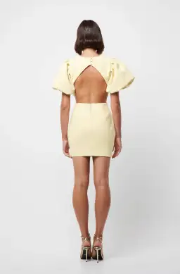 Set the tone for a stylish season in the Splendour Mini Dress. Crafted from a durable fabric in a soft butter hue, this dress features voluminous puff sleeves, a fitted silhouette and cut out back. Perfect to pair with heels or knee-high boots for a night out.