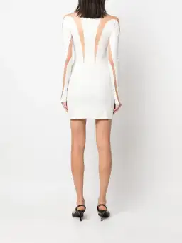 Logo-plaque sheer-panel dress from MUGLER featuring white, stretch design, sheer panelling, cut out detailing, silver tone logo lettering, round neck and long sleeve.