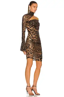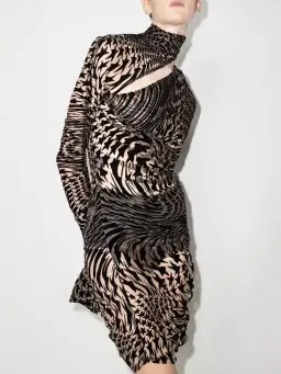 Black/beige nude star-print cut-out dress from MUGLER featuring semi-sheer construction, star print, cut-out detailing, ruched detailing, high neck, long sleeves and flared cuffs.