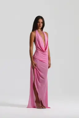 Anastasia can be worn 2 ways - maxi as pictured or stylish mini. Soft Georgette drapes fluidly from a halter neckline, falling into a deep cowl front. Adjustable cord tie sits underneath the bust to secure the drape to the bodice and support an exaggerated open back. Considered in wearability, Anastasia's self-lined front and wrapped back feature create playful coverage. In full length, Anastasia appears as an elegant evening gown, her silhouette long and fluid. The skirt can then be gathered and tied to one side, shortening the hemline into a flirtatious mini length with chic side draping. Lightweight and slightly sheer Georgette further Anastasia's ethereal yet sophisticated aesthetic.