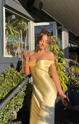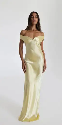 An off-shoulder silk gown that leads into an elasticated back feature to highlight the décolletage.