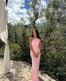 Fabienne is an elegant one-shoulder gown designed with versatility in mind. Featuring an adjustable threaded strap detail, it gracefully ties at the neck and open back, offering a refined and customizable look. Crafted from stretch Cavalli fabric, the gown showcases deliberate ruching across the body, creating a textured, artful appearance. The full-length skirt is contoured to perfection, with curved line details that dip at the waist, accentuating and celebrating the feminine silhouette.