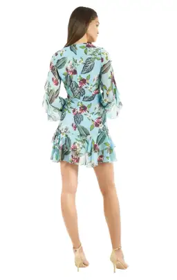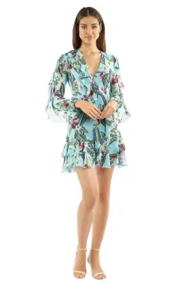 Featuring a flattering wrap style silhouette with long bell sleeves and ruffle detailing, this flouncy mini is a playful take on the classic! Hire it to wear to your next wedding or high tea!