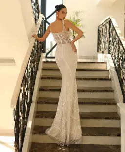 A true embodiment of elegance and allure in our NC1080 Gown by Nicoletta Australia. This unique gown features a see-through, corset-style bodice, back zipper, and a tulle overlay covered in sparkling sequins and beads that cascades gracefully from the cinched waist. This gown has no stretch..