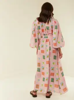 "A maxi dress crafted from 100% Premium Linen. A Palm Classic silhouette, the Noddy is an all-year-round go-to. Printed in our exclusive, hand-painted in our Pink Emblem Print. Featuring voluminous blouson sleeves with elasticated cuffs & a statement eyelet belt.
