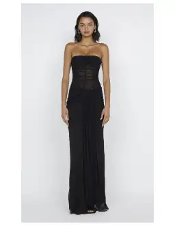 The Bec & Bridge Noemi Strapless Dress in Black features a sheer mesh bodice with ruched detailing and a twisted drape detail, creating a visually impactful design while maintaining elegance, perfect for any formal occasion.