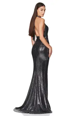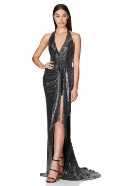 The stunning Bellagio gown by Nookie features a plunging neckline, thigh high split up one side, floor length train in a metallic gunmetal foil effect fabric.