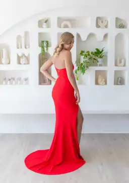 Glamourous one shoulder gown with fine elastic shoulder strap. Exaggerated mermaid hem and sexy side frontt split. Made from our signature form fitting scuba crepe.