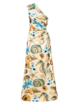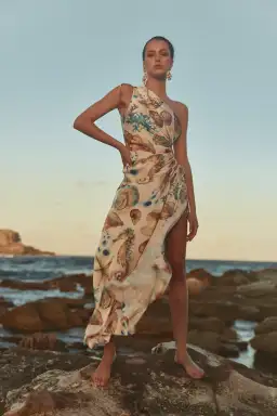 The sensual, yet structured one-shoulder silhouette features an adjustable tie at the hip/waist, with sculptural ruching to showcase an extremely feminine shape and high split for a flattering fit. The Nour Maxi Dress is a full length sophisticated maxi dress designed to wear day to night, which exudes classic elegance mixed with sultry sophistication.