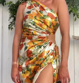 The sensual, yet structured one-shoulder silhouette of the Nour dress features an adjustable tie at the hip/waist, with sculptural ruching and a high split for a flattering fit. Cut from our Yarden Floralprint.