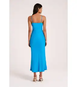 The Lea Cupro Dress in azure is made in Nude Lucy's signature cupro fabric with a soft, sueded hand feel. Cut on the bias, this silhouette drapes over the body softly and finishes ankle length. Features include a v neckline with an adjustable gathered bodice at centre front which allows for versatility in wear and adjustable thin straps.