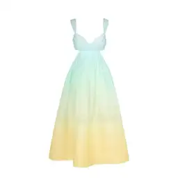 Exclusive Zimmermann X LeBon Marche Ready to wear collection. Only available exclusively at the Paris pop up store! The Oasis gown spotlights a sweetheart bralette-style neckline and side cutouts that wrap into an open back. This sleeveless piece is finished with self tie straps and a beautiful ombré colour. Please note reference photos model is wearing a size 1 (this dress available is a size 0)