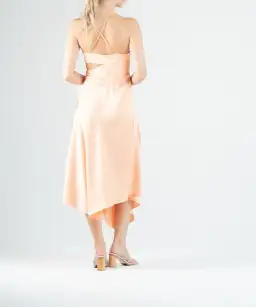 Cut on the bias the mid length skirt sculpts with the curve of the hip, kicking out into a fluid skirt for added volume and movement. Finished with an asymmetrical hemline that just grazes the ankle."