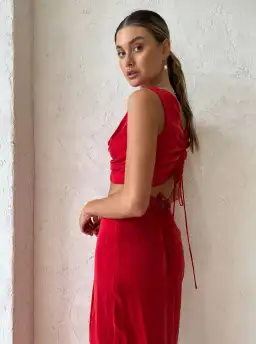 Top: Crafted from a delicate Cupro fabrication with a luxuriant hand feel this crop falls under the bust and features a horizontal wrap drape across the chest. Sleeveless in design, the straps are cut into a v-neckline to subtly highlight the décolletage and the back is detailed with adjustable ruching that can be tightened as you wish.