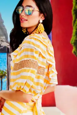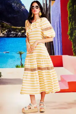 This sunshine yellow striped dress by Trelise Cooper is crafted from linen and features a one-shoulder balloon sleeve lined in a ruffle, a slim at the waist with a belted that can be fastened at the back or front, long flowing skirt ending at a maxi length.