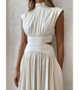 Crafted from a Linen blend fabrication, this maxi dress forms and flatters the femme figure with its sophisticated high neck, gathered bodice and complimenting waist cut outs at the structured panel waist.