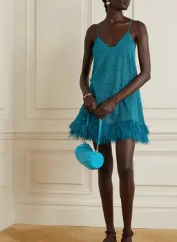 Made from shimmering azure stretch lurex that's sure to draw attention at your next event. It has a low back and wispy feathers along the mini hem