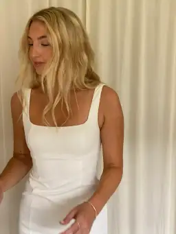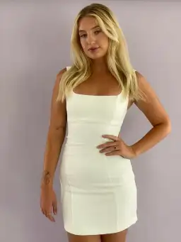 Evoking a timeless appeal with its tank silhouette, this sleeveless bustier style keeps detail to a minimum in its fitted silhouette and subtle seam detail throughout the bodice. The dress expands on its classic appeal with its soft square neckline and back.