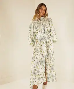 The Apollo Dress is a maxi dress crafted from 100% premium Linen. Featuring intricate pintuck detailing across the chest & a frilled button down collar. Billowing blouson sleeves and a statement eyelet buckle belt. Pair the Apollo with your favourite sandal, sneaker or Winter boot to take you from casual to dressy.