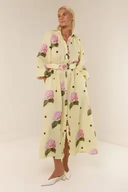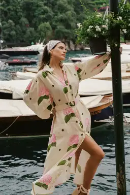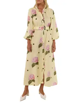 The Noddy Dress in our exclusive Portofino Polka Dot print is crafted in 100% Premium Linen. The Noddy Dress is designed as a relaxed midi dress silhouette. Featuring blouson sleeves with elasticated cuffs, stand collar and centre front buttons. The Noddy Dress is designed to hang loosely from the body, and has matching buckle belt to bring in the waist. Please refer to our size and fit guide for further fit details