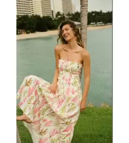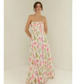 The Primrose Dress in Sea Garden is a strapless maxi dress, crafted from a premium Linen. Featuring a shirred elasticated back panel, fitted bodice and A-line skirt for a feminine finish. This dress is sold with detachable adjustable straps Midi Length Strapless with detachable straps Invisible Back Zip