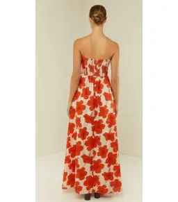 The Primrose Dress in Red Hibiscus is a strapless maxi dress, crafted from a premium Linen. Featuring a shirred elasticated back panel, fitted bodice and A-line skirt for a feminine finish. This dress comes with detachable adjustable straps.