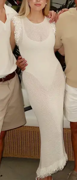 Features: Open-knit maxi silhouette, hand-beaded detailing at the shoulders and hem, refined textural finish. Fabric: Knitwear 100% cotton.