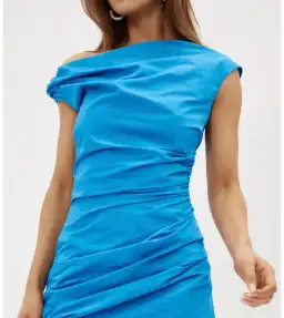Paris Georgia Remmy Mini Dress in Turquoise. A softly structured mini dress that falls off one shoulder