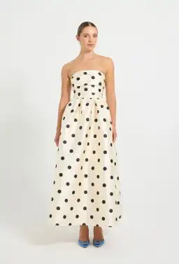 The Dottie Strapless Midi by PASDUCHAS is crafted from a lustrous-finish taffeta and features an exclusive cream and black polka dot print. This strapless silhouette is defined by textural tucks through the bodice that enhance and flatter the shape, while a structured waist seam cinches the figure before falling into a full, voluminous midi-length skirt. Functional side pockets add a modern, practical touch. Lined through the bodice and finished with a centre-back zipper, this style is ideal for statement event dressing.