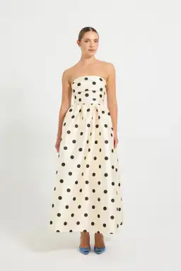The Dottie Strapless Midi by PASDUCHAS is crafted from a lustrous-finish taffeta and features an exclusive cream and black polka dot print. This strapless silhouette is defined by textural tucks through the bodice that enhance and flatter the shape, while a structured waist seam cinches the figure before falling into a full, voluminous midi-length skirt. Functional side pockets add a modern, practical touch. Lined through the bodice and finished with a centre-back zipper, this style is ideal for statement event dressing.