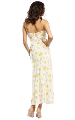 An ease in sophistication is high end and feminine in the Fiesta Tie Midi. Fresh ivory and golden tones feature in this exclusive novelty palm print set against silk touch drapey crepe fabric. Gathers over the bodice create texture and shape while the subtle sweetheart neckline is suspended by barely there straps for the ultimate in décolletage flattery. Skimming the hip on bias and falling to traditional midi length, the look is effortlessly chic yet cool. Fully lined throughout.