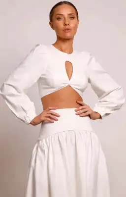 A modern look for your separates wardrobe, the Meadows Top by PASDUCHAS is made from a stretch slub linen blend. A clean cut bodice is fitted closely to the body cropped just under the bust featuring a key hole cut-out highlighted with corded piping throughout. Voluminous sleeves drawn in at the cuff with elastic detail. Open ended zip at centre back to fasten.