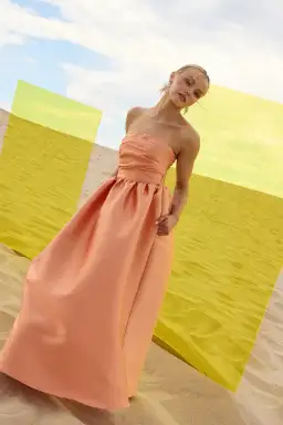 The Pippa Strapless Midi by PASDUCHAS is crafted from lustrous-finish taffeta in a bold sunset orange hue. It features a strapless neckline with textural tucks through the bodice that create a flattering shape, cinched at the waist before flaring into a full midi-length skirt complete with pockets. The piece is secured with a concealed centre-back zipper for comfort and ease of fit.