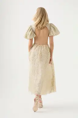 "With short puff sleeves, an open back, fitted bodice and relaxed midi skirt, the Patina Lace Midi Dress is a classic Aje silhouette. Imagined in 100% cornelli lace, this dress is sophisticated yet party friendly."