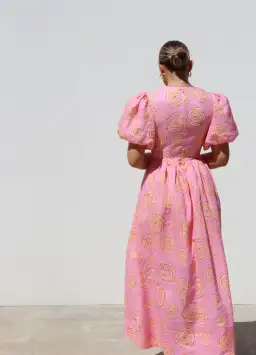 The Puff Sleeve Dress featured a fitted bodice and short puff sleeve, with a long gathered skirt and invisible zip closure at the back. It is made in our original Peony print on IL Exclusive lightweight linen and is fully lined in 100% cotton. This linen is soft and sheer, giving the dress a light and floaty feel.