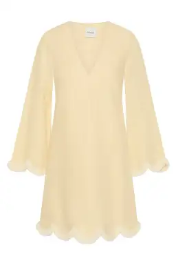 The Essie Kaftan is cut from airy linen and features a deep v-neckline and long billowy sleeves. It's traced with chic contrast fringing along the scalloped hem and cuffs.