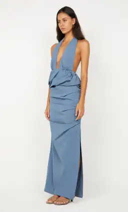 This captivating halter neck maxi dress features a unique bubble detail at the underbust and a deep V-neckline, creating a flattering and sophisticated silhouette perfect for formal events, a wedding guest ensemble, or a stylish night out.