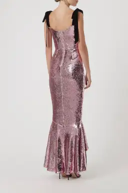 The Addie Gown in Salmon by Rachel Gilbert is a contemporary sequined occasion dress, perfect for a special event.