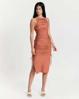 The Bailey Dress by Rachel Gilbert experiments with texture creating a bandage ruching effect that elegantly cuts across the figure-hugging silhouette, a fashion-forward choice destined for your next event.