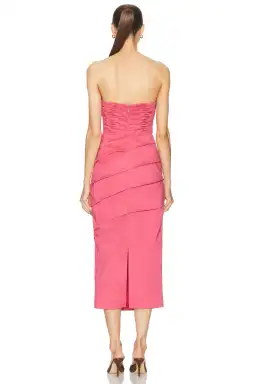 Features a modern curved neckline across a strapless slim column silhouette. Designed with intentional draping across the bust and waistline to flatter the female form. This silhouette is fully lined and is fastened by an invisible zip closure. Has a split at the back of the dress.