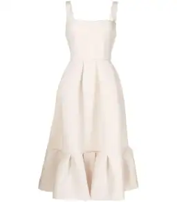 Rachel Gilbert’s Cora Dress is a timeless piece you'll want to have for years! Cinched waistline, straight neckline, and ruffled hemline in their signature scuba neoprene. Perfect to rent for an elegant wedding occasion!
