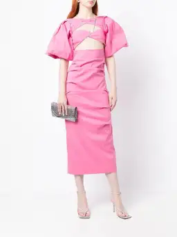 An eveningwear update, the Dahli Dress balances exaggerated sleeves with a form fitting silhouette, complete a self tie embellished strap. Falling to a mid length silhouette complete with bust cut outs and an elasticised back.