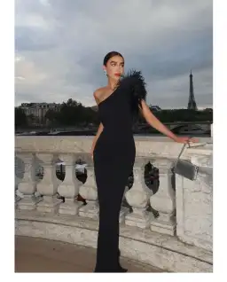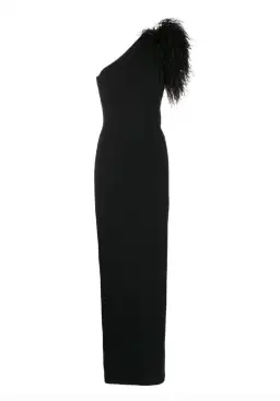 Crafted from a thick, stretch knit fabric featuring a one shoulder neckline and a full length, slim fit. The Elcie Gown features black feather detailing across the shoulder for an effortlessly chic feel.