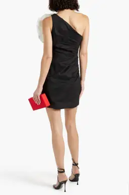 A slim fitting one shoulder mini silhouette featuring an asymmetric front hemline and ruched side seem, complete with a sculpturally inspired flower.