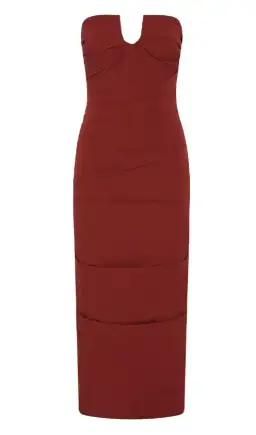A strapless silhouette featuring a curved U-shaped bustline and hand-draped detailing to flatter the female form. Constructed with an internal corset for definition and support, and finished with a back split for ease of movement.